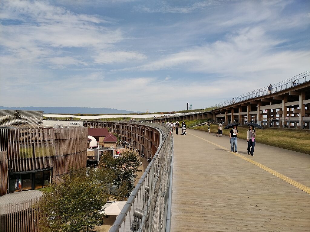 大屋根リングはいいですね。休憩するベンチもたくさんあったし、ドリンク販売機も比較的安価に設置されていました。トイレの場所は少々少なく感じました。