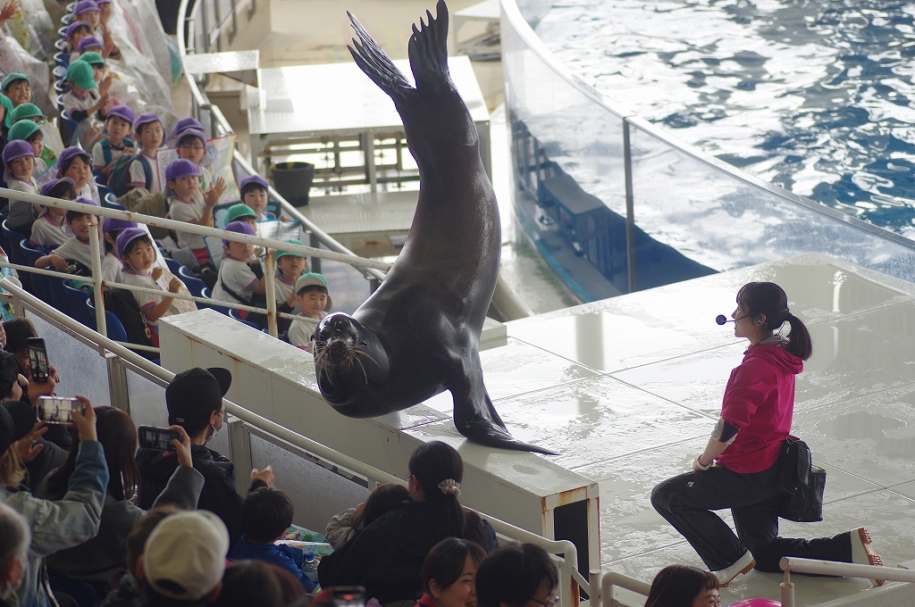 アシカとイルカショー。あまり大きくないプールなので、イルカの交差するようなジャンプは観れませんが、MCの女性の盛り上げが上手で楽しめました。